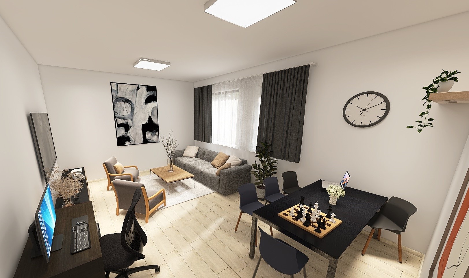 A kikapcsolódásról sem feledkeztünk meg. Közösségi szobáinkban tévé, darts és csocsó is található, valamint beszélgetésre és közös időtöltésre is van lehetőség.
